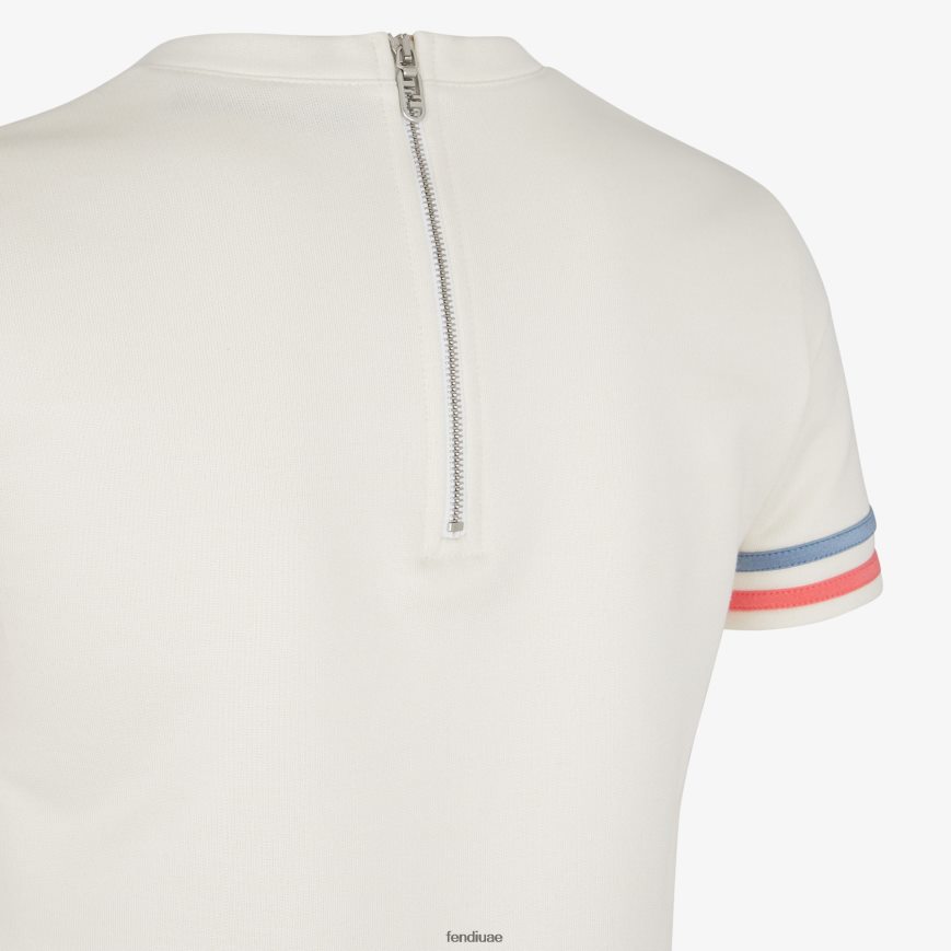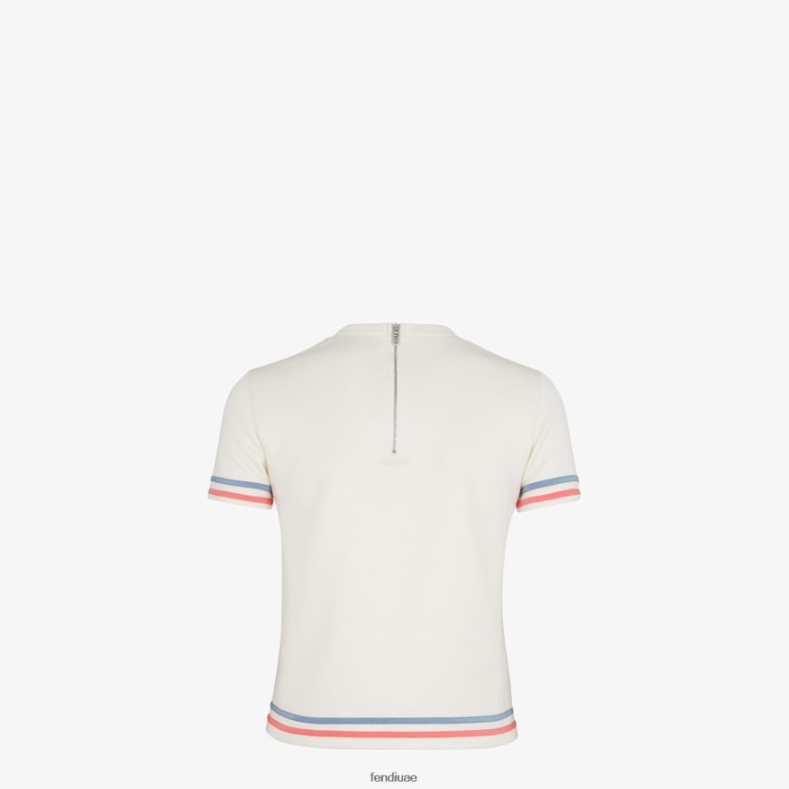 تي شيرت مربع الشكل بأكمام قصيرة ورقبة دائرية. مصنوع من جيرسي الحرير الأبيض. مزين بحروف فندي المطرزة على الجهة الأمامية وخطوط رياضية على الحدود باللون الوردي والأزرق الفاتح.