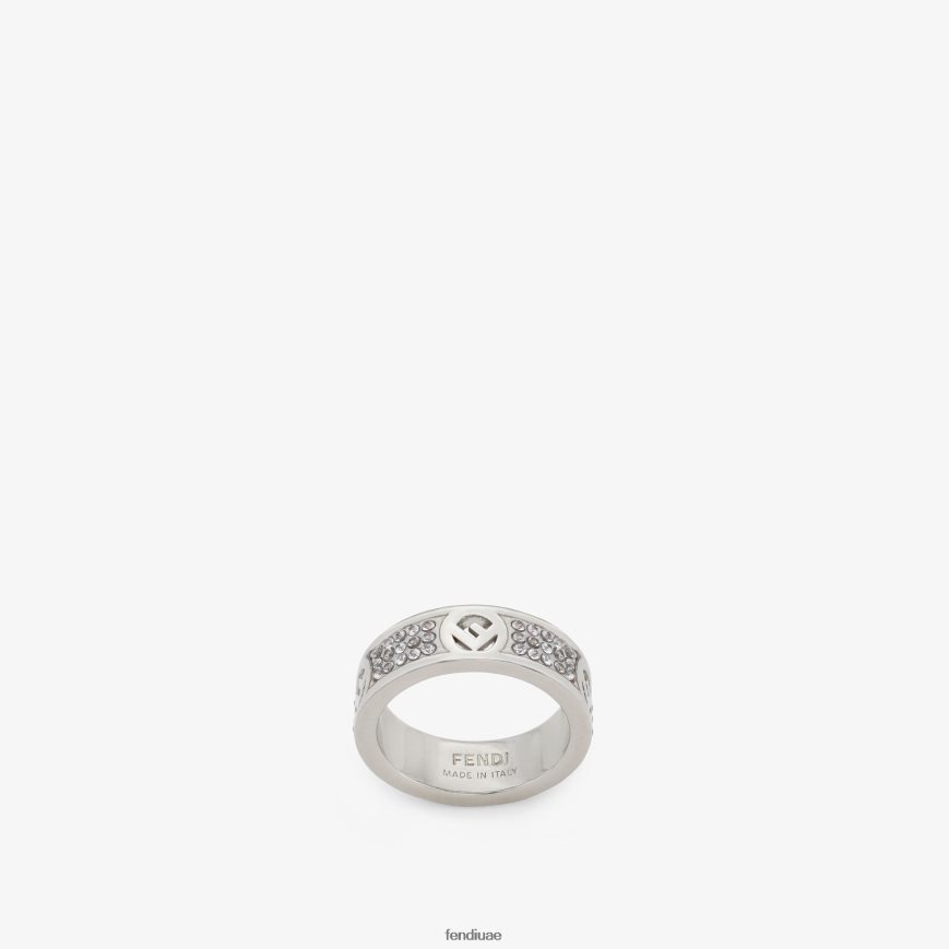 خاتم بزخرفة محفورة على شكل حرف f على شكل فندي. مصنوعة من معدن البلاديوم. مزين بالكريستال الطبيعي.