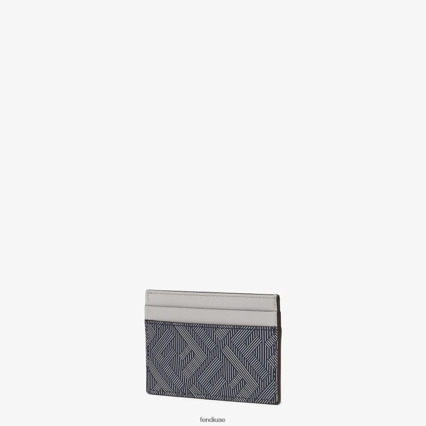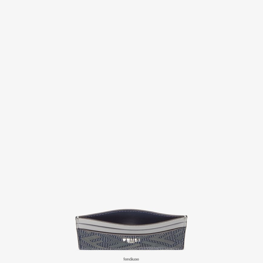 حاملة بطاقات مصنوعة من جلد فندي المظلل باللونين الرمادي الفاتح والأزرق، مع شريط مزخرف على شكل حرف ff. حروف فندي روما وأدوات معدنية مطلية بالبلاديوم.