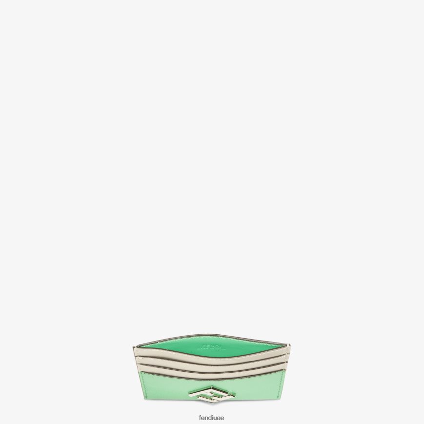 محفظة ff Diamonds بشعار ff قطري وحجرة مركزية وستة فتحات للبطاقات. مصنوع من الجلد الأبيض والأخضر. أدوات معدنية مطلية بالبلاديوم.