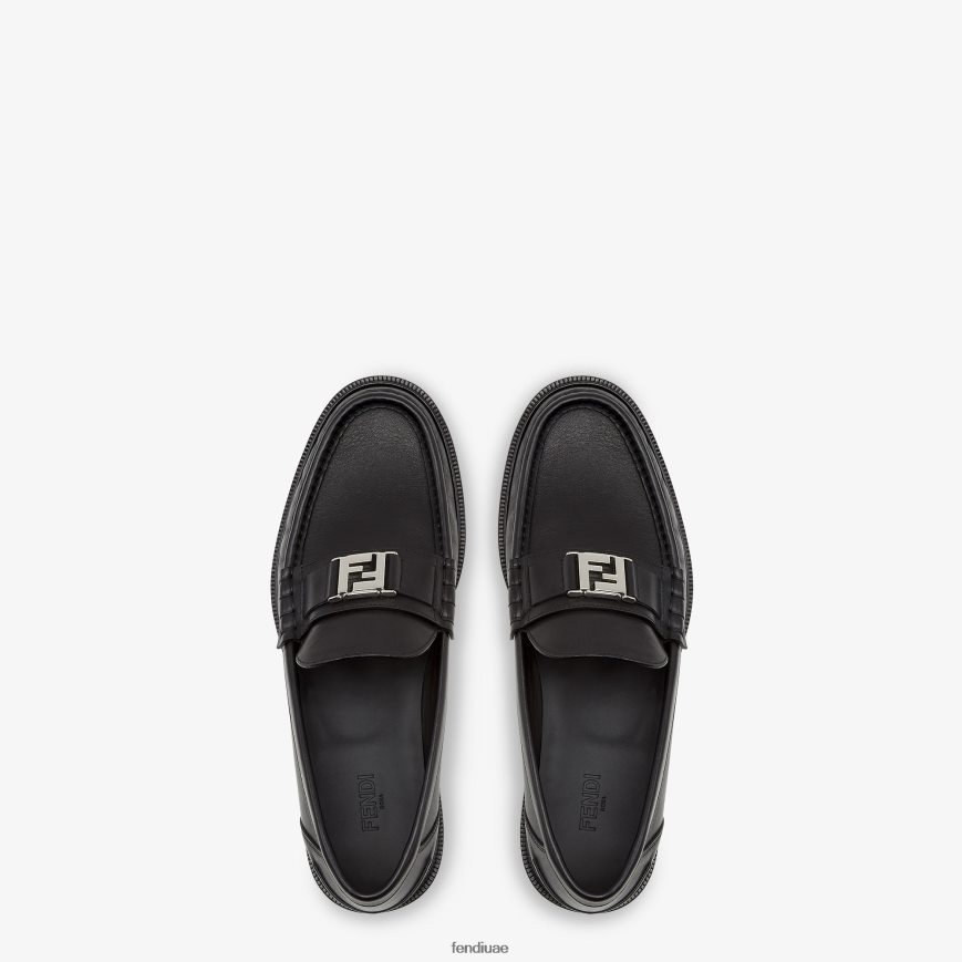 حذاء بدون كعب مزين بشعار ff. مصنوع من الجلد الأسود. باطن جلدية. أدوات معدنية مطلية بالبلاديوم.
