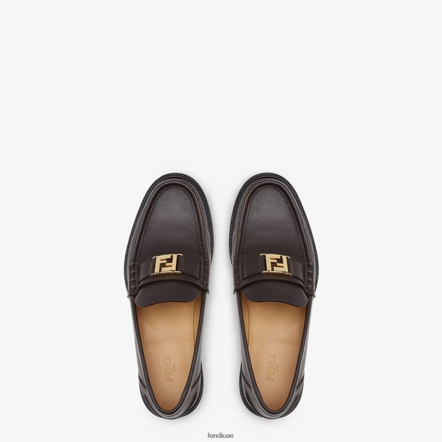 حذاء بدون كعب مزين بشعار ff. مصنوع من الجلد البني. باطن جلدية. أدوات معدنية مطلية بالذهب.