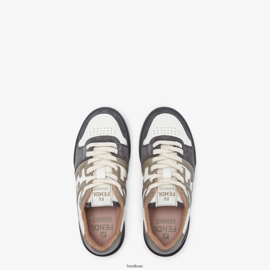 أحذية فندي الرياضية ذات الأربطة. مصنوع من الجلد الأبيض مع تفاصيل باللون الرمادي الداكن وإدراج من جلد الغزال البني. نعل مطاطي مع حروف فندي على الجانب.