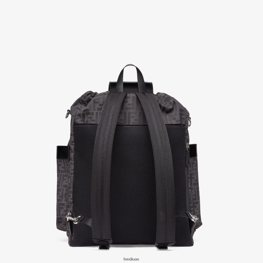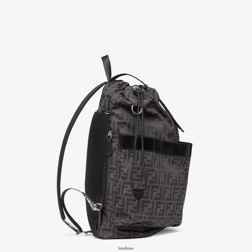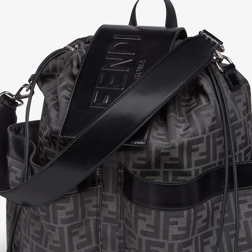 حقيبة ظهر كبيرة من قماش الجاكار مع شعار FF باللونين الأسود والرمادي. تفاصيل من الجلد الأسود وغطاء مع شعار فندي روما منقوش.