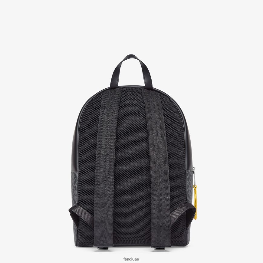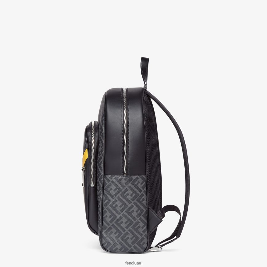 حقيبة ظهر بجيب أمامي مصنوعة من القماش بنقش FF باللونين الأسود والرمادي. مزين ببطانة قطرية من الجلد باللونين الأسود والأصفر.
