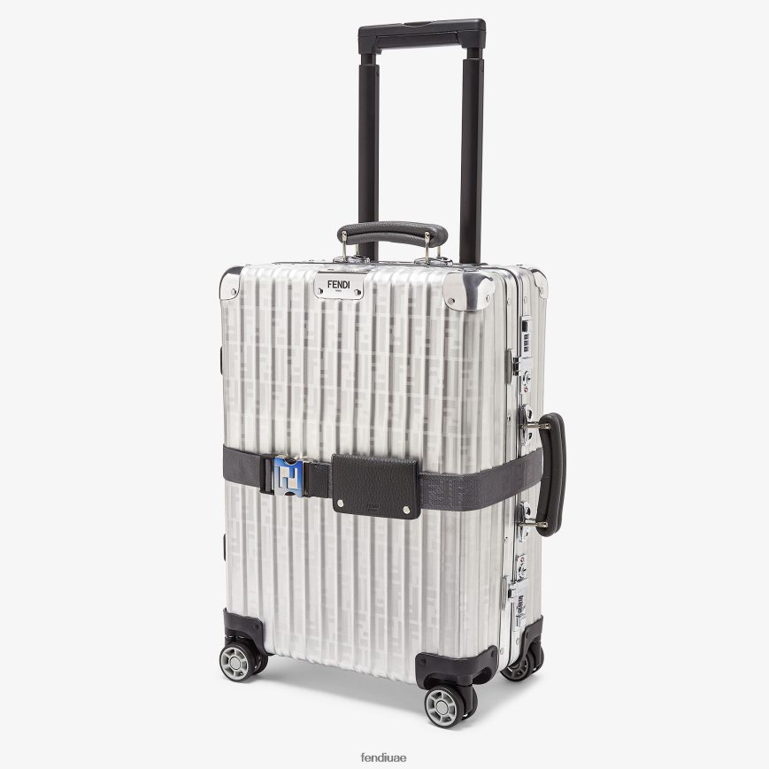 حقيبة سفر من الألومنيوم ذات أربع عجلات بحجم المقصورة مع شعار ff وتفاصيل من جلد cuoio romano باللون الرمادي. يحتوي هذا الطراز الخفيف والمتين على مقبضين، ومقبض تلسكوبي، وقفل مزدوج، وقفل مركب. القسم الداخلي مبطن بقماش مزين بشعار ff، ويحتوي على قسم بجيب بسحاب وأشرطة قابلة للتعديل. تم تضمين علامة العنوان.