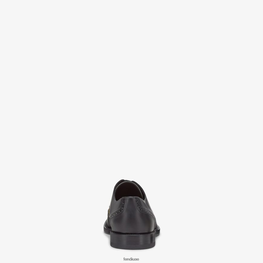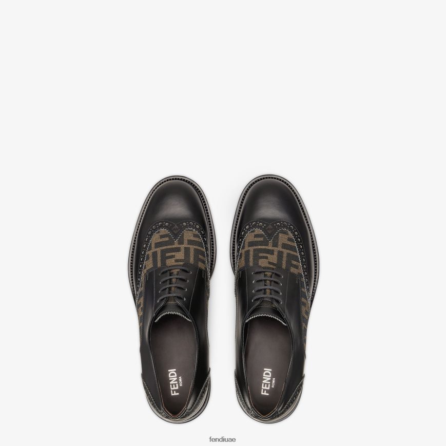 أربطة ديربي مع خياطة البروغ. مصنوع من الجلد الأسود. تم تشطيبه بإدخالات من القماش باللون الأسود والتبغ. نعل جلدي مع قالب حقن من مطاط مانع للانزلاق مع شعار ff.