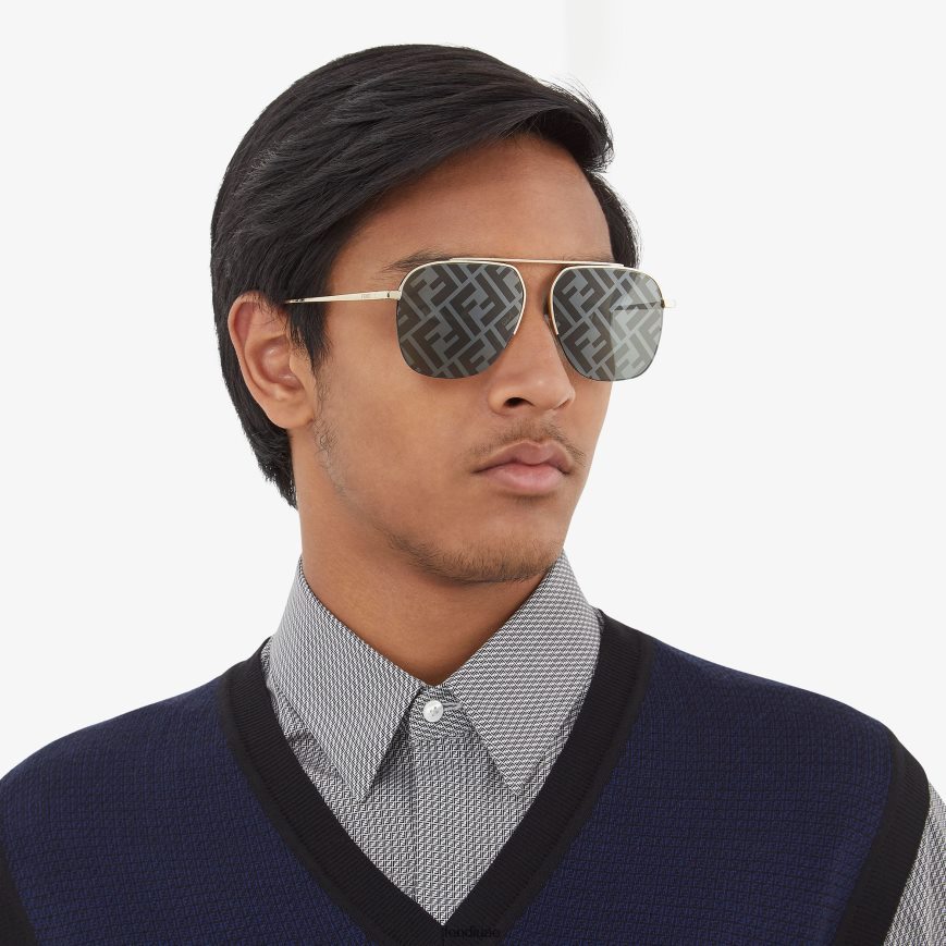 إطارات تجريبية من المعدن المطلي بالذهب. يتميز الجزء الأمامي من الإطار بنمط ff منقوش على الجزء العلوي وخيط معدني أسود على الحافة السفلية. عدسات رمادية مع شعار ff بتأثير مرآة فضي بالكامل. وسادات أنف قابلة للتعديل تحمل شعار فندي.