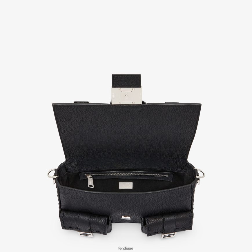 حقيبة باغيت متعددة الجيوب مصنوعة من جلد كيويو رومانو باللون الأسود، مع 5 جيوب بأحجام مختلفة ومزينة بخياطة يدوية كبيرة. الجيوب والغطاء الأمامي مزينان بإبزيم ff الأيقوني.