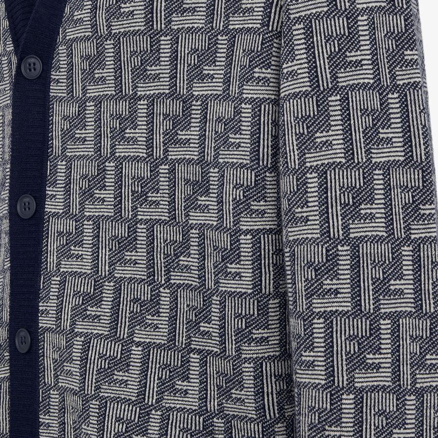 سترة برقبة على شكل حرف V مع لون أزرار مطابق. الحدود مزينة بالتضليع. مصنوع من خيوط الصوف مع رسم ظل فندي من قماش الجاكار باللونين الأزرق والأبيض. حواف وحواف مضلعة بلون أزرق.