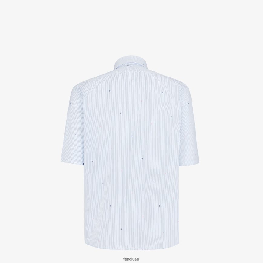 قميص بأكمام قصيرة وذو مقاس عادي. جيب التصحيح على الصدر. إغلاق أمامي بسحاب وأزرار. مصنوع من القطن المخطط باللون الأزرق الفاتح. مزين بزخارف صغيرة مطرزة بالكامل في ظلالين متباينين وشعار فندي روما المطاطي مطبق على جيب الصدر. يتميز السحاب بوجود منزلق معدني من فندي أولوك مع شريط سحب طويل مطابق.