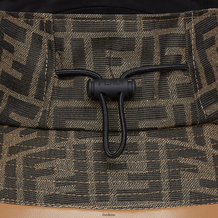 قناع على شكل قبعة دلو مع إمكانية تعديل الرباط. مصنوع من القماش بزخارف جاكار ff بظلال من اللون البني. الحافة مزينة بجلد بيج.