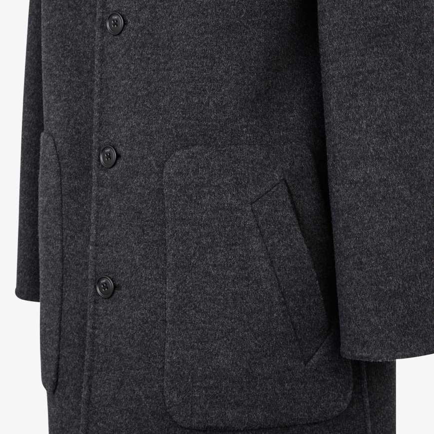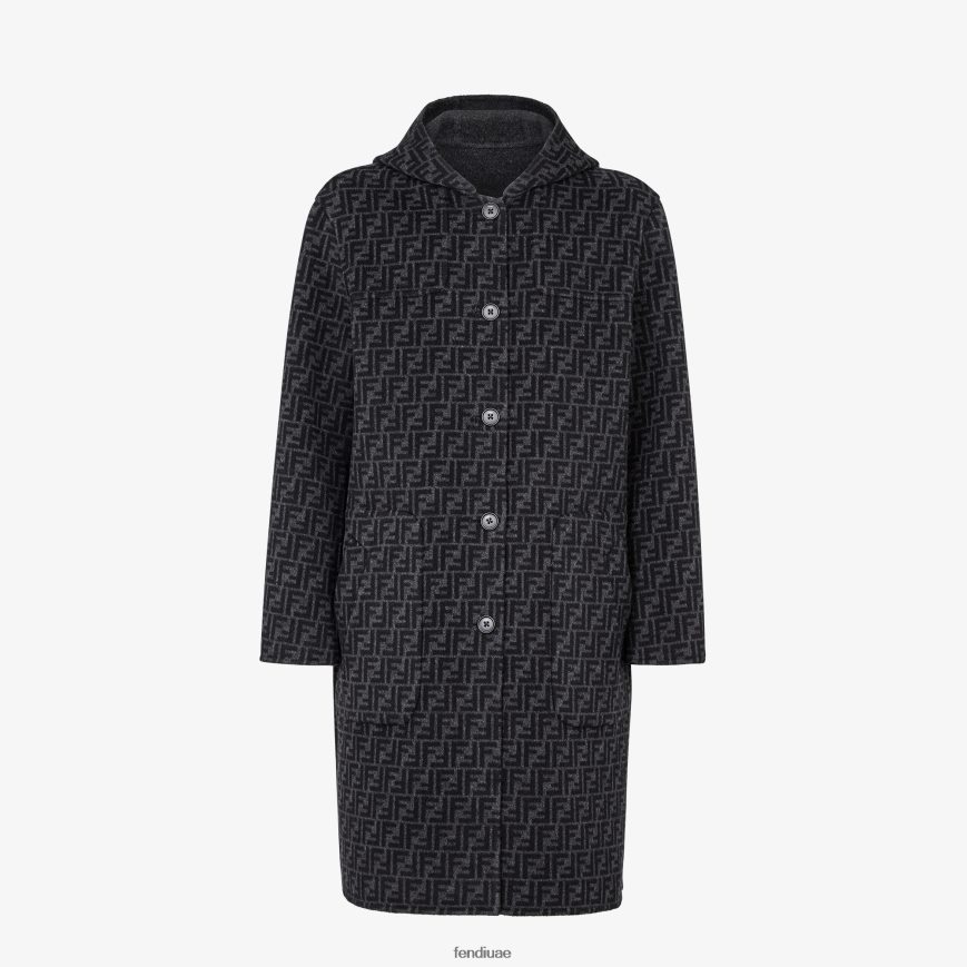 معطف ذو وجهين مع غطاء محرك السيارة. جيوب على الجانبين، وإغلاق أمامي بأزرار. مصنوعة من الصوف الرمادي. بطانة مزينة بشعار ff باللون الأسود.
