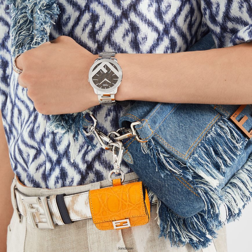 علبة دائرية لامعة مقاس 41 مم من الفولاذ المقاوم للصدأ بلون فضي مع لمسة نهائية من الفولاذ المقاوم للصدأ. قرص بأشعة الشمس بني بعيد عن المركز مع طبعة ff سوداء شفافة ومؤشرات وعقارب فضية. سوار من الفولاذ المقاوم للصدأ بلون واحد، مقاس 20/18 ملم، مع شعار ff منقوش ومشبك قابل للطي.
