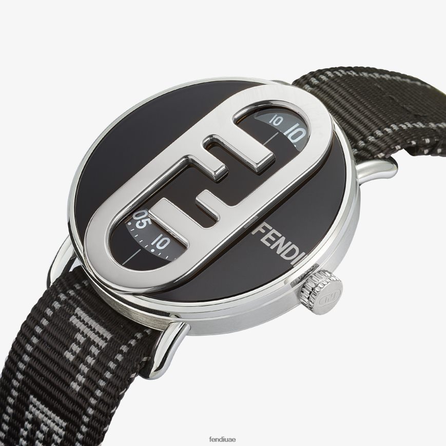 علبة مستديرة من الفولاذ المقاوم للصدأ فضية اللون، قياس 42 ملم، مع شكل بيضاوي فندي يظهر الوقت. تاج مع شعار ff محفور. قرص من زجاج الياقوت الأسود غير الشفاف مع شعار فندي الأبيض. أقراص الساعات والدقائق والثانية بخلفية سوداء وأرقام بيضاء ورمادية فاتحة. سوار من النايلون الأسود مع حروف فندي من الجاكار الرمادي، وحلقتين للحافظة، إحداهما تحمل شعارًا محفورًا، وإبزيم ذو شق فضي اللون.