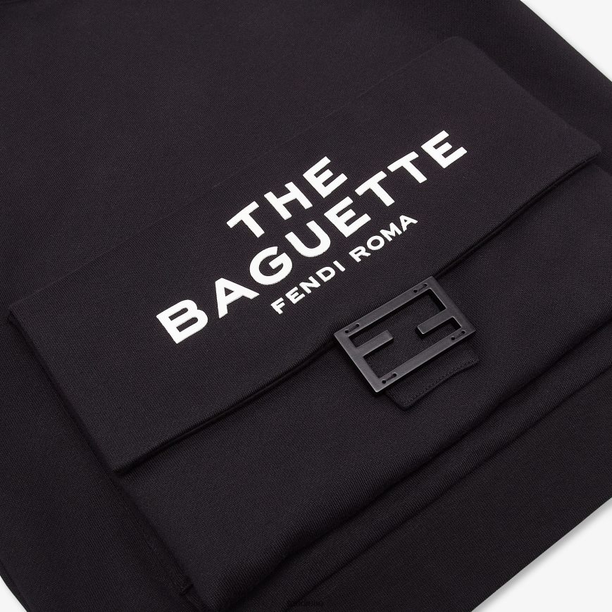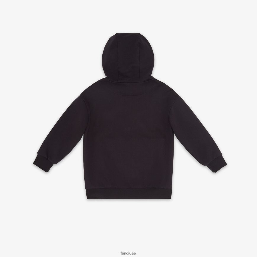سويت شيرت جونيور ميني مي ستايل أسود مع غطاء رأس وجيب أمامي كبير. جزء من إصدار فندي من مارك جاكوبس المحدود، هذا الطراز مطبوع عليه عبارة "باغيت فندي روما" باللون الأبيض.