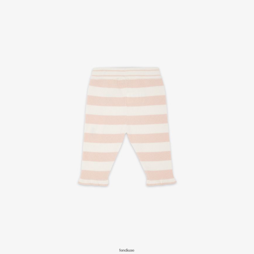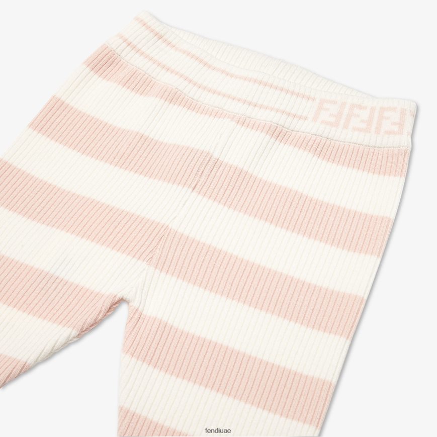 بنطلون للأطفال مصنوع من مزيج الصوف المخطط باللونين الكريمي والوردي. مع كشكشة وشعار ff وردي على الخصر.