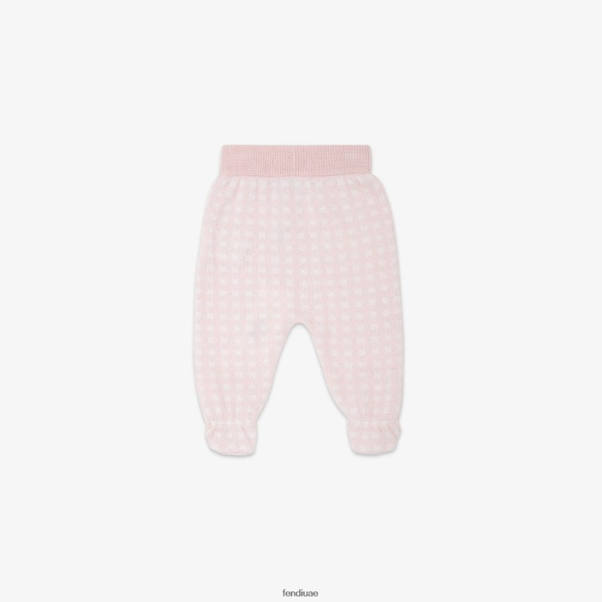 بنطلون أطفال محبوك من القطن والكشمير مع تصميم مربعات باللونين الأبيض والوردي.