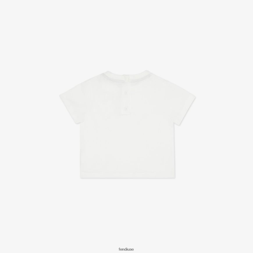 تي شيرت جيرسي أبيض بأكمام قصيرة للأطفال مع تطريز فندي تيدي بير على الجيب.