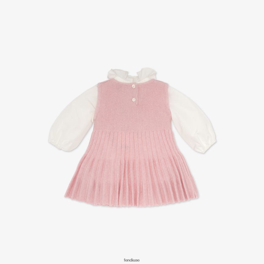 فستان أطفال من الصوف المحبوك باللون الوردي مع تطريز فندي بألوان متعددة وفيونكة التبغ. يأتي الفستان مع بدلة من البوبلين الأبيض مع ياقة.