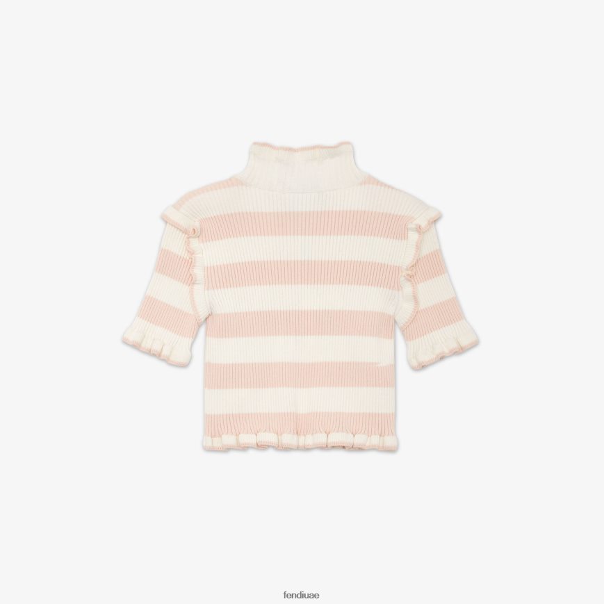 بلوزة للصغار مصنوعة من مزيج الصوف مع خطوط باللونين الكريمي والوردي. مع كشكشة على الجهة الأمامية وشعار ff وردي على الياقة.