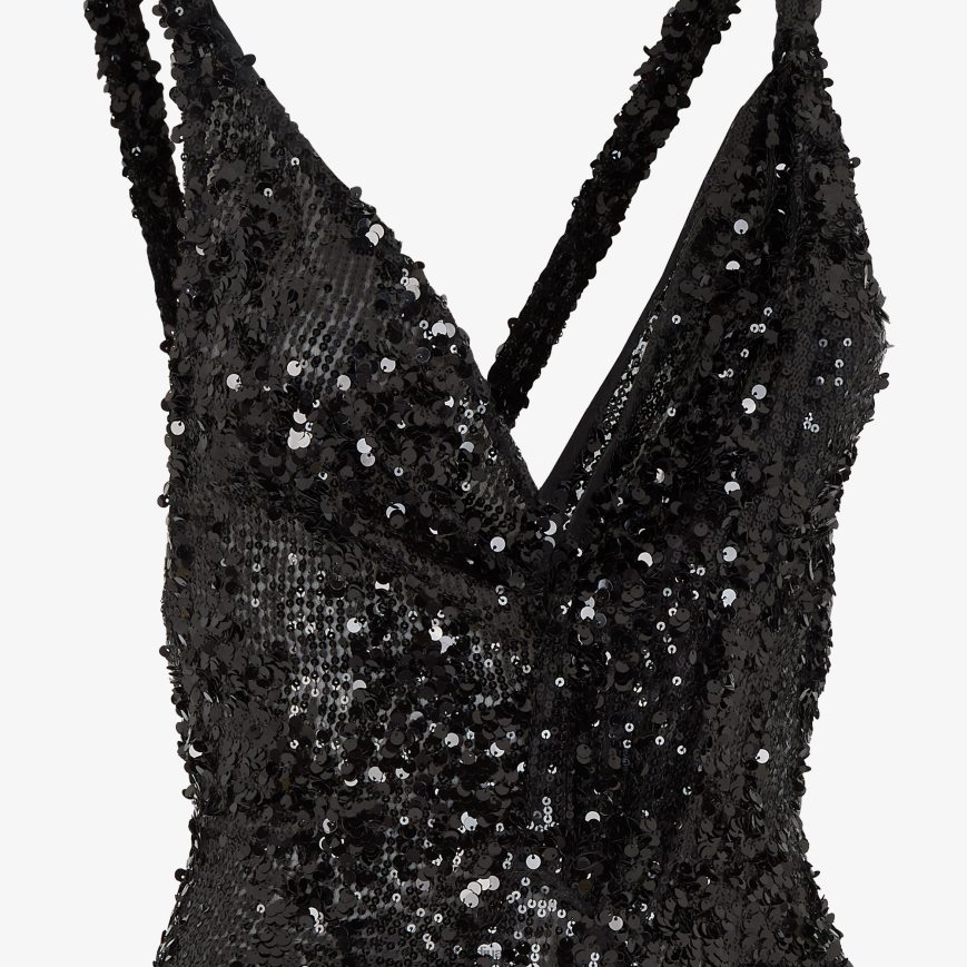 فستان طويل بدون أكمام مع فتحة عنق على شكل حرف V وحمالات كتف متقاطعة في الخلف. فضفاض وأنثوي مع فتحة عميقة غير متماثلة في الأمام. إغلاق بسحاب خلفي غير مرئي. مصنوع من الشيفون الحريري الأسود ومغطى بالكامل بتطريز الترتر ذو الألوان المتطابقة. تخلق الصناعة، المستوحاة من إعادة إصدار مجموعة ربيع/صيف 2000 ذات اللون الأصفر، تأثيرًا متطورًا ثلاثي الأبعاد مع ترتر دائري بحجمين مختلفين.