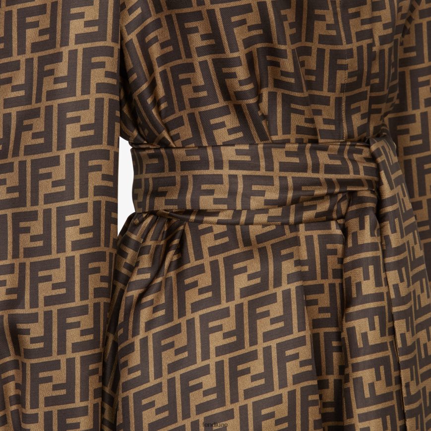 فستان قصير على شكل قميص مع ياقة كلاسيكية، وأكمام بأزرار ووشاح مطابق. إغلاق مخفي بأزرار. مصنوع من نسيج قطني طويل مع شعار ff باللون البني والتبغ.