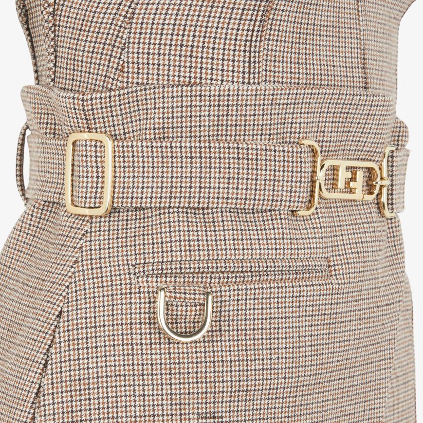 فستان قصير بلا أكمام. يتميز الثوب بحزام قابل للإزالة مع بيبلوم جانبي وجيب بحاشية وحلقة معدنية. إبزيم معدني من فندي أولوك مع لمسة نهائية ذهبية. مصنوع من نسيج ممزوج بالصوف ومزين بنقش مربعات باللون البيج. أدوات معدنية مطلية بالذهب.