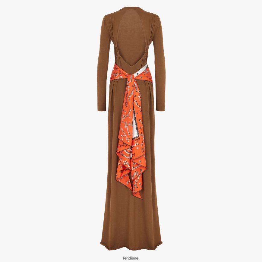 فستان طويل بياقة دائرية وأكمام طويلة. قطع مزودة بفتحات جانبية عميقة. مصنوع من نسيج صوف بني خفيف الوزن. يتميز الجزء الخلفي بتفاصيل مقطوعة وأربطة فولارد حريرية طويلة يتم تثبيتها حول الخصر، مع رسم تنجيم فندي باللونين البرتقالي والأبيض. مزين بأساور وياقة مضلعة وحاشية حافة خام.