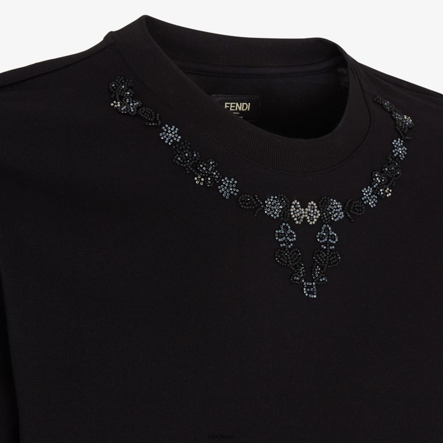 تي شيرت كبير الحجم بأكمام قصيرة ورقبة دائرية. مصنوع من الجيرسيه الأسود. مزينة بزخارف نباتية ذات خرزات دقيقة ومطرزة على الياقة بألوان متباينة.