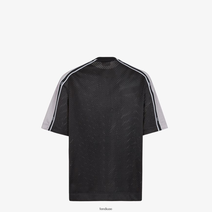 تي شيرت برقبة دائرية وأكمام قصيرة. مصنوع من شبكة تقنية سوداء، مع حروف فندي روما على الجهة الأمامية. أما الأكتاف والأكمام فهي مزخرفة بشريط متباين وشرائط جاكار رياضية تحمل شعار فندي.