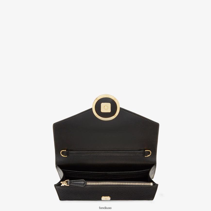 f هي حقيبة صغيرة من فندي ذات غطاء هندسي مزين بشعار فندي. تثبيت بالضغط. الجوانب والجزء الداخلي مقواة مثل المحفظة، مع ثمانية فتحات للبطاقات، وجيب مسطح وجيب بسحاب. حزام كتف بسلسلة قابلة للفصل. مصنوع من جلد العجل الأسود. أدوات معدنية مطلية بالذهب.