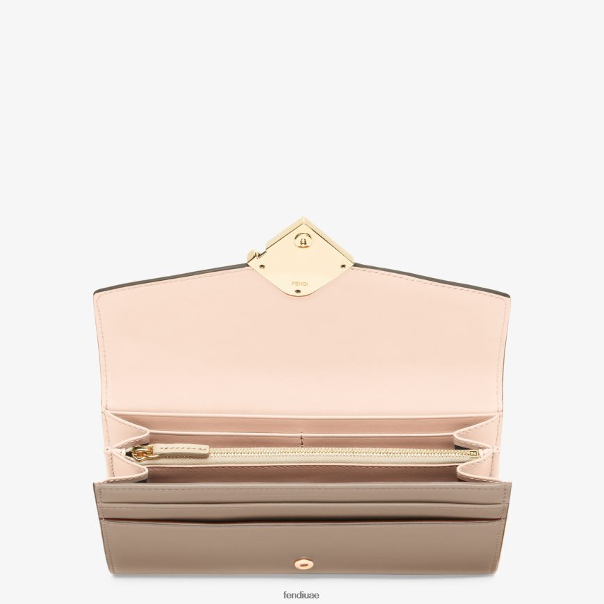 محفظة ff Diamonds Continental تُغلق بكبسة. واسعة ومنظمة بشكل جيد، مع جيبين مقواين، وجيب بسحاب، وعشرة فتحات للبطاقات، وجيوب جانبية مسطحة. مصنوع من الجلد باللون الرمادي الفاتح، مع غطاء وتفاصيل من الداخل من الجلد باللون الوردي الفاتح. أدوات معدنية مطلية بالذهب.