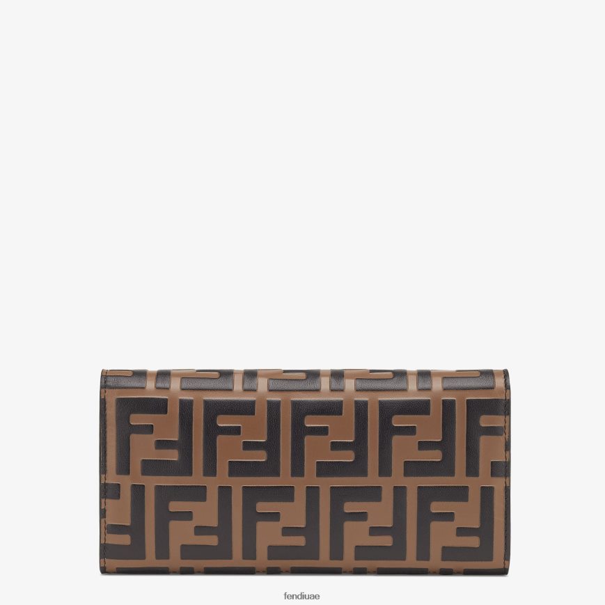 محفظة كونتيننتال إف فندي مزودة بحزام كتف رفيع قابل للفصل. تم تصميم الجزء الداخلي على شكل محفظة تحتوي على جزأين مقويين وجيب بسحاب وجيوب مسطحة وستة فتحات للبطاقات. مصنوع من الجلد البني. تم تشطيبه بزخارف منقوشة ومرسومة يدويًا. أدوات معدنية مطلية بالذهب.