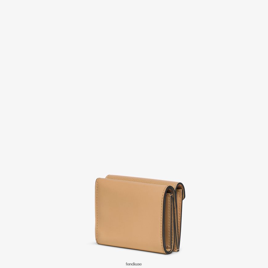محفظة ff Diamonds متوسطة ثلاثية الطي. مقسمة إلى ست فتحات للبطاقات، وجيب للعملات المعدنية مع زر كبس. مصنوع من الجلد البيج. أدوات معدنية مطلية بالذهب.