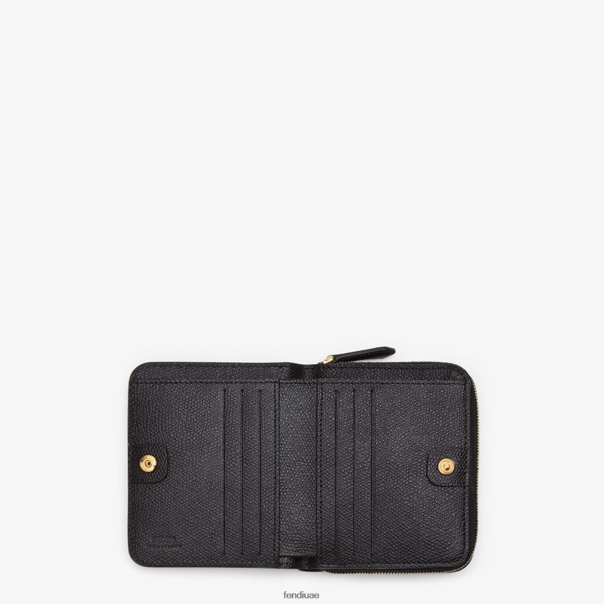 f هي محفظة فندي مدمجة ثنائية الطي. تم تنظيم الجزء الداخلي في حجرة الفواتير وفتحة حامل البطاقة. تتميز بجيب خارجي للعملات المعدنية مع سحاب للإغلاق على ثلاثة جوانب. مصنوع من جلد كروز الأسود. أدوات معدنية مطلية بالذهب.
