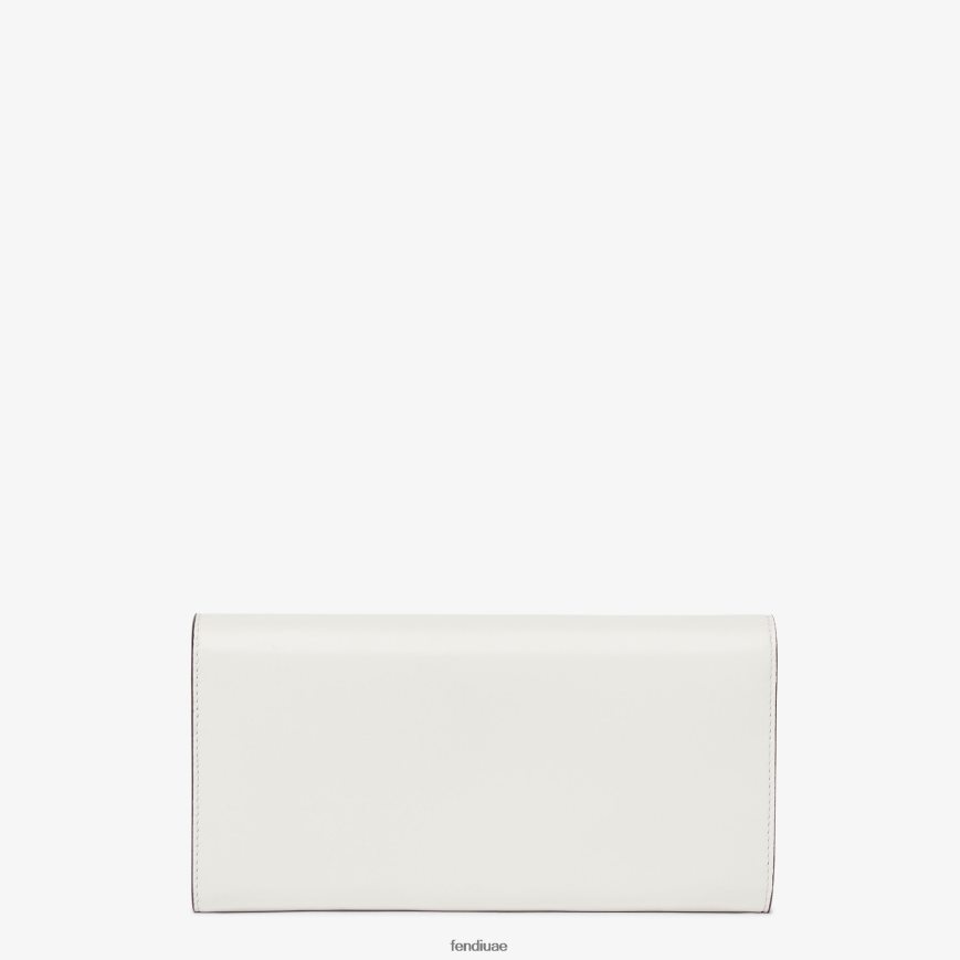 محفظة فندي روما كونتيننتال بسلسلة معدنية قصيرة. يتميز الجزء الداخلي بحجرتين مقواتين، وجيب بسحاب، وجيبين مسطحين وعشرة فتحات للبطاقات. مصنوع من الجلد الأبيض. أدوات معدنية مطلية بالذهب.