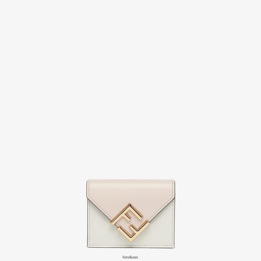 محفظة ff Diamonds متوسطة ثلاثية الطي. مقسمة إلى ست فتحات للبطاقات، وجيب للعملات المعدنية مع زر كبس. مصنوع من الجلد الأبيض مع غطاء كاميليا. أدوات معدنية مطلية بالذهب.