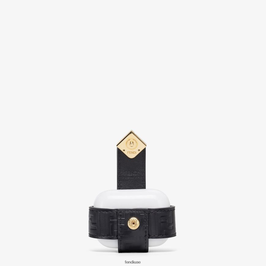 حافظة Airpods Pro مع مشبك وحلقة مخصصة. مشبك ff قطري مع زر مغناطيسي. مصنوع من الجلد باللون الأسود ومزين بطبعة ff صغيرة منقوشة. أدوات معدنية مطلية بالذهب.