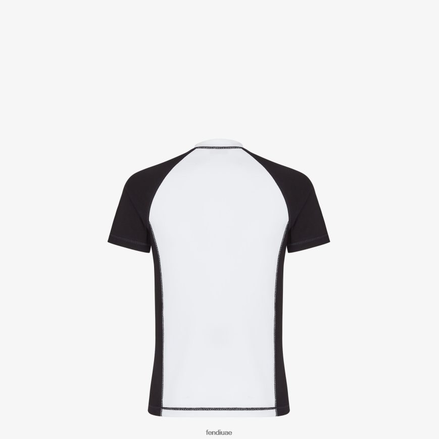 تي شيرت ضيق بياقة عالية وأكمام ريجلان قصيرة. مصنوع من القطن الأبيض المطاطي مع حشوات سوداء وخياطة سوداء. شعار فندي روما على الصدر.
