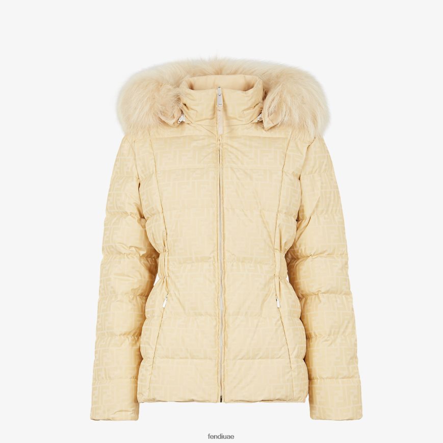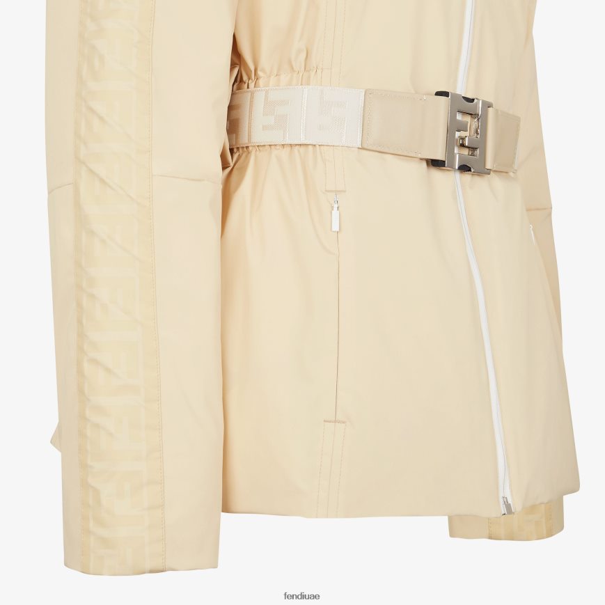 سترة تزلج ذات وجهين بياقة عالية وغطاء رأس قابل للإزالة مزين بفرو الثعلب. حشوة مطاطية على الخصر مع حزام مطابق. جيوب جانبية بسحاب وجيب لحامل بطاقات التزلج على الكم الأيسر. اغلاق سحاب البنطلون. مصنوع من النايلون الكريمي المجدد مع حشوة. أحد الجانبين بلون ثابت مع شريط ff مطبوع بلون مطابق على الأكمام، والآخر مخصص بزخارف مطبوعة بالكامل على شكل ff. حزام شريطي مطاطي مزين بزخارف جاكار ff وإبزيم ff معدني مطلي بالبلاديوم. حشوة من ريش البط المُعاد تصنيعها.