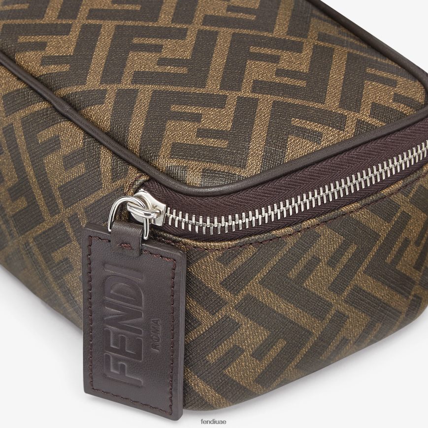منظم سفر صغير مصنوع من القماش مع شعار ff باللون البني والتبغ. تم تشطيبه بتفاصيل من الجلد البني. بطانة قماش متطابقة. أدوات معدنية مطلية بالبلاديوم.