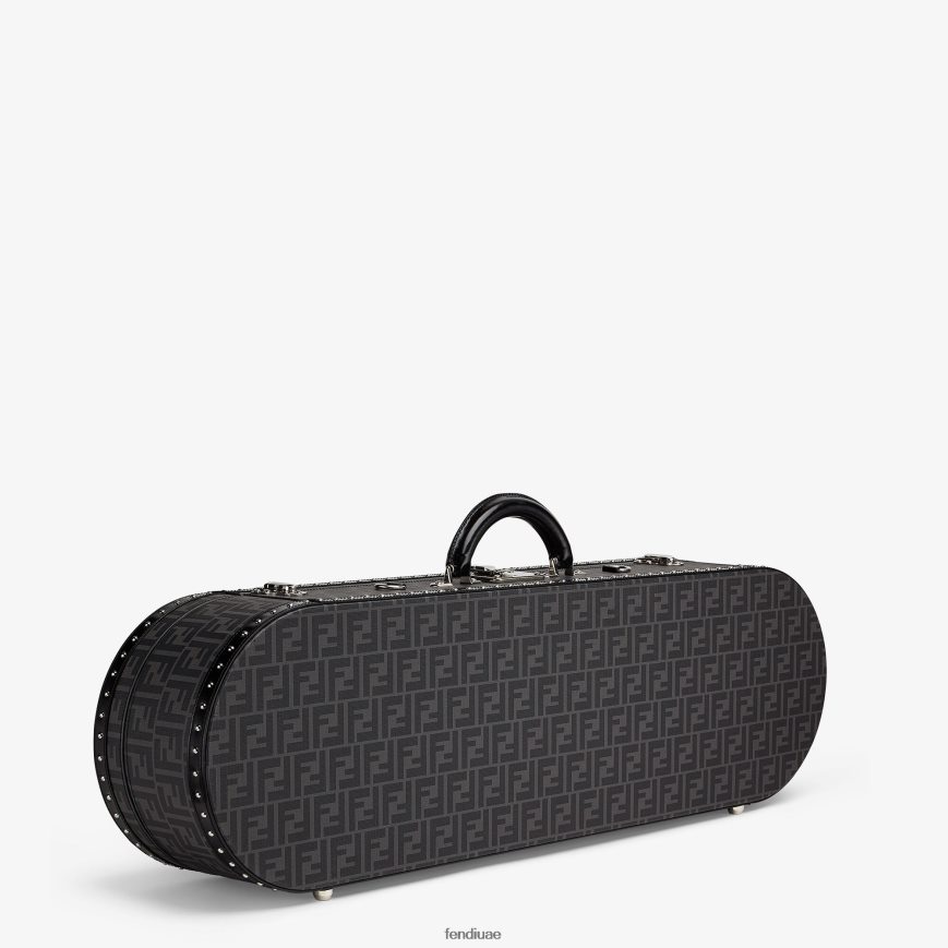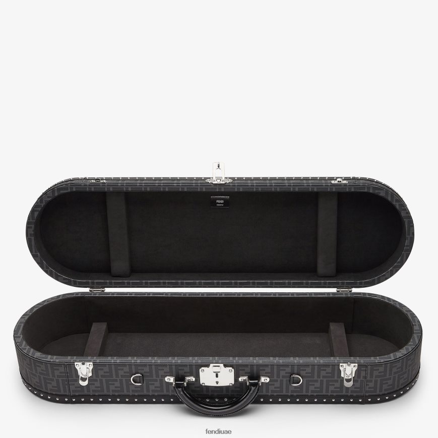 صندوق حامل لوح تزلج بيضاوي صلب مع مقبض وإبزيم مشبك. مصنوعة من البولي يوريثان مع شعار ff باللونين الأسود والرمادي. مزين بالجلد الأسود وتفاصيل المسامير. أدوات معدنية مطلية بالبلاديوم.