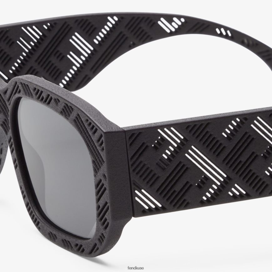نظارة فندي مستطيلة الشكل. هيكل من النايلون الأسود باستخدام تقنية الطباعة ثلاثية الأبعاد وزخرفة مخططة على الإطار بأكمله. عدسات رمادية.