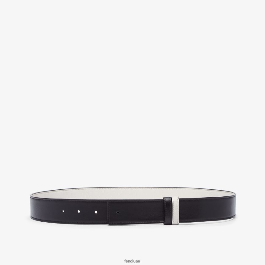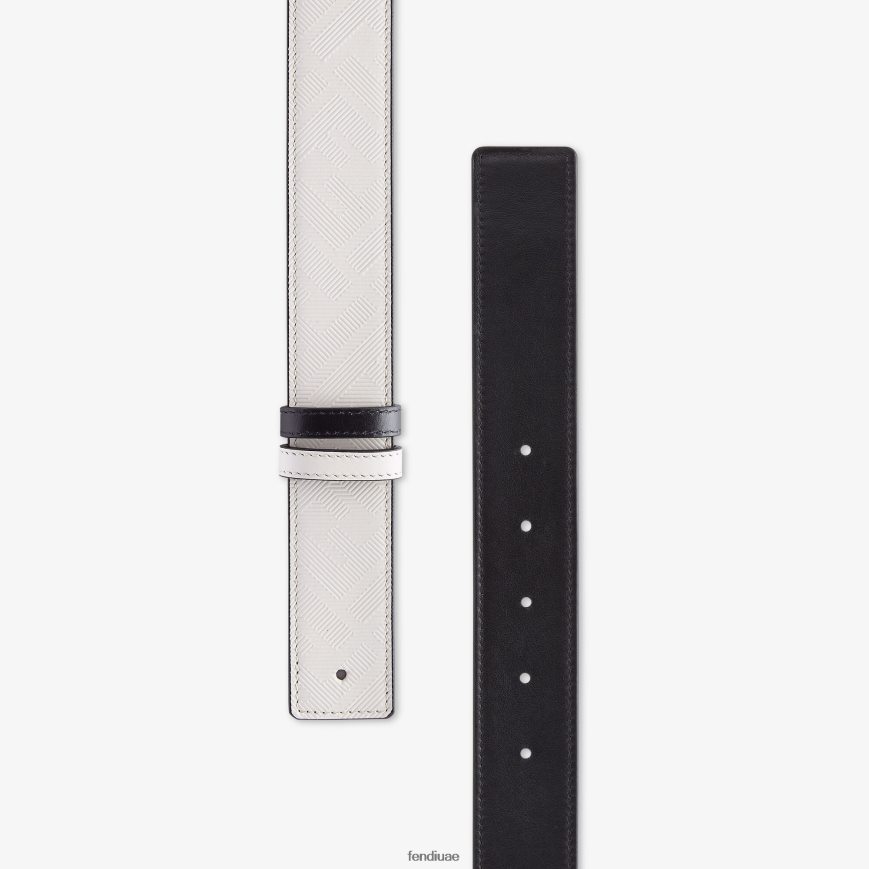 حزام ذو وجهين يُكتمل بإبزيم مسماري. مصنوع من جلد فندي المظلل باللون الرمادي الفاتح مع نسيج مخطط على شكل حرف ff. بطانة جلدية سوداء.