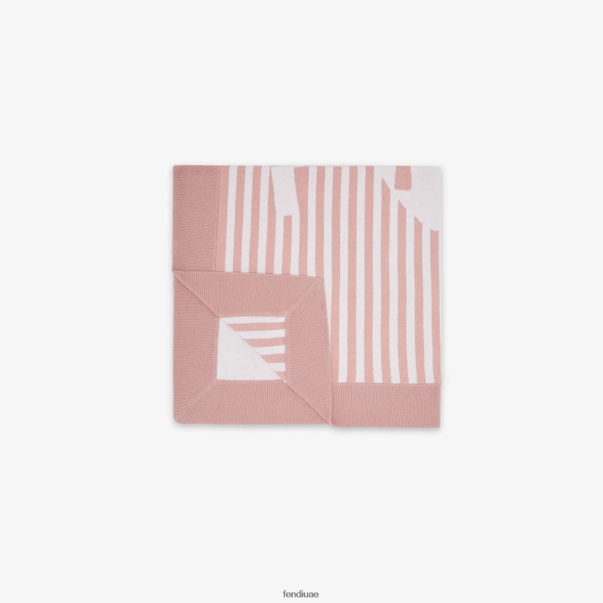 بطانية أطفال من القطن والكشمير باللون الوردي مع إنتارسيا حروف فندي باللون الوردي والخطوط البيضاء.