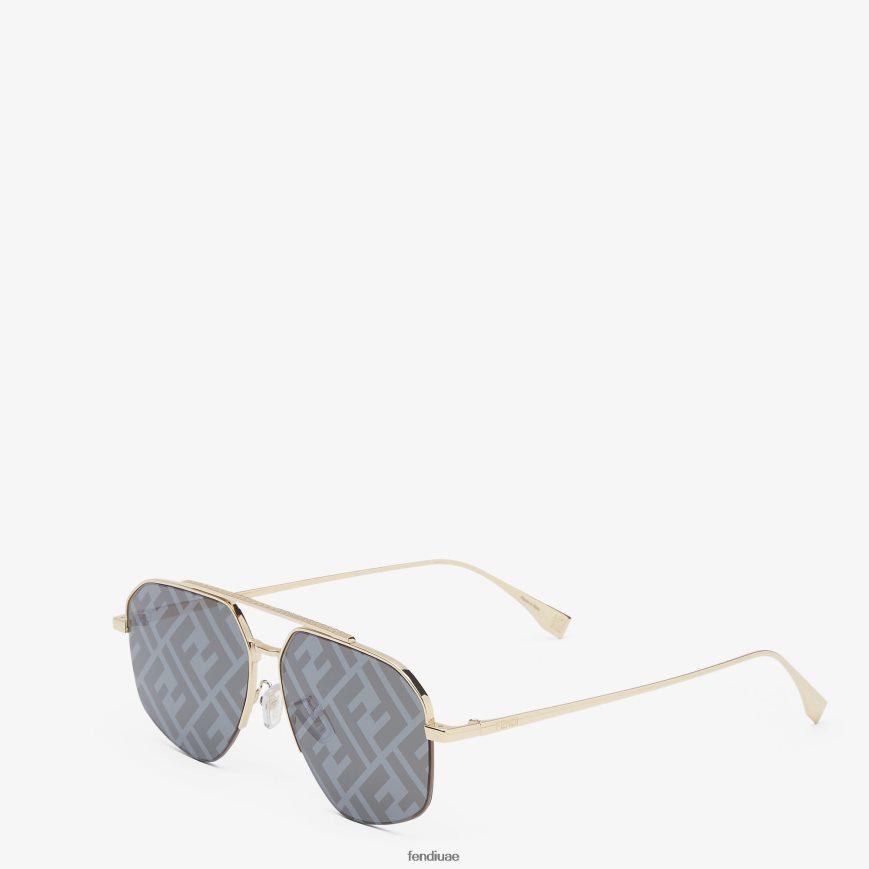 نظارات شمسية مربعة الشكل من المعدن باللون الذهبي. تتميز الواجهة ذات الجسر المزدوج بنمط ff محفور في الجزء العلوي. عدسات باللون الرمادي مع شعار ff. وسادات أنف قابلة للتعديل تحمل شعار فندي.