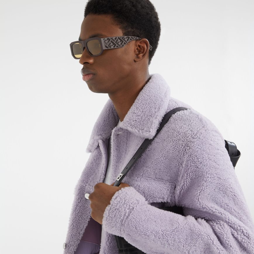 نظارة فندي مستطيلة الشكل. مصنوع من النايلون البني باستخدام تقنية الطباعة ثلاثية الأبعاد وملمس مخطط على الأذرع. عدسات صفراء.