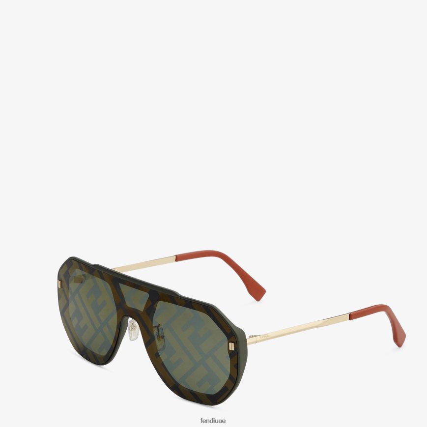 نظارات شمسية مربعة باللون الأخضر الداكن ودرع مصبوبة بالحقن مع أذرع معدنية ذهبية اللون وأطراف حمراء. تم تزيين العدسة الخضراء المفردة بطباعة شعار ff بتأثير المرآة الذهبية. وسادات أنف قابلة للتعديل تحمل شعار فندي.