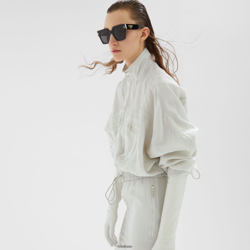 نظارات فندي روما الشمسية المربعة كبيرة الحجم مصنوعة من الأسيتات السوداء. أذرع ذات نواة معدنية مرئية محفورة بالليزر. شعار فندي روما باللون الذهبي على الجانبين. عدسات رمادية.